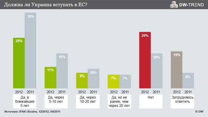 Украина должна стать членом Европейского Союза, считают 52 процента украинцев. Однако сейчас число сторонников евроинтеграции находится на самом низком уровне за последние два года. Таковы данные репрезентативного опроса DW-Trend, проведенного в декабре 2012 года украинским отделением Института изучения рынка и общественного мнения IFAK по заказу DW. В ходе исследования были опрошены 1000 человек в возрасте от 18 до 65 лет.