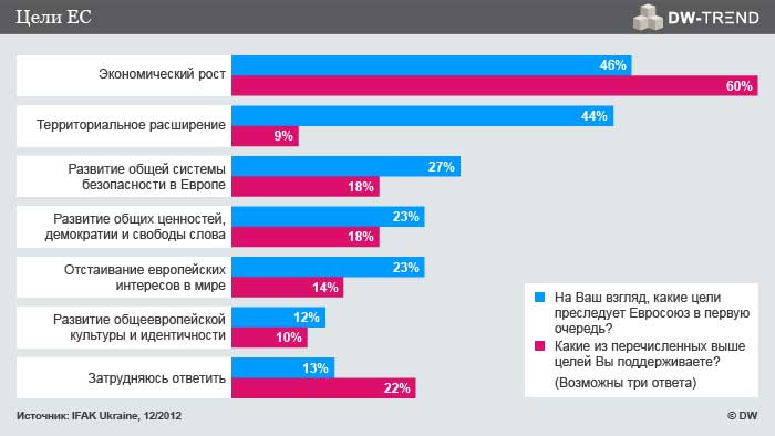 Основной целью Евросоюза 46 процентов украинцев по-прежнему считают экономический рост, и большинство из них эту цель поддерживают (60 процентов). В то же время лишь 23 процента опрошенных считают, что ЕС руководствуется в первую очередь развитием общих ценностей, демократии и свободы слова. Еще меньше респондентов - 18 процентов - сами поддерживают эти устремления Евросоюза. Это на семь процентных пунктов меньше, чем полгода назад.