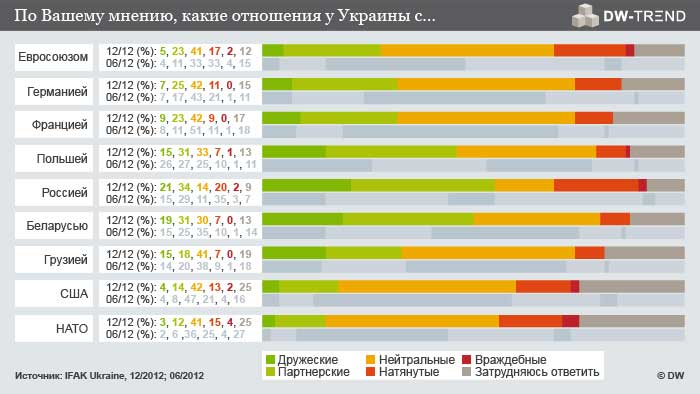 Многие украинцы полагают, что связи между Украиной и Германией улучшились: 32 процента, по данным опроса DW-Trend, считают, что Киев и Берлин объединяют дружеские или партнерские отношения. Вдвое - с 21 до 10 процентов - сократилась с июня по декабрь 2012 года доля тех, кто видит в германо-украинских отношениях напряженность или враждебность.