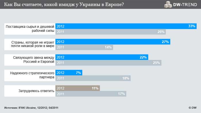 При этом многие украинцы, по данным опроса DW-Trend, считают, что у их страны негативный имидж за рубежом. Только 22 процента респондентов видят в Украине связующее звено между Европой и Россией. Если в 2011 году 14 процентов опрошенных полагали, что их страна не играет серьезной роли в международной политике, то теперь такого мнения придерживаются 27 процентов. Каждый третий отводит Украине лишь роль поставщика дешевой рабочей силы и ресурсов; надежным стратегическим партнером назвали страну 7 процентов участников опроса.