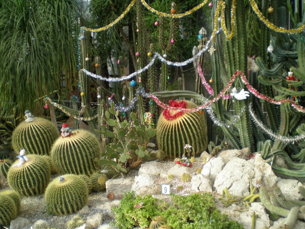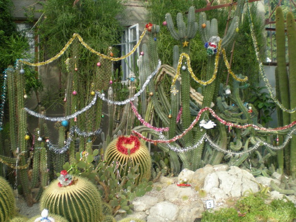 У главного входа в сад гостей встречает нарядная секвойя, в кактусовой оранжерее – одетый в новогодний наряд кактус эспостоа. «Кактусы этой разновидности без колючек с пышной белой опушкой. Мы украсили несколько кустов, и теперь они украшают территорию сада. Это необычно», – отметила Ольга Гончарова. Кроме того, золотыми шарами и гирляндами украшены растения суккуленты, которые растут у входа в кактусовую оранжерею. На террасах оранжереи высажены кактусы, напоминающие змей – символ 2013 года.