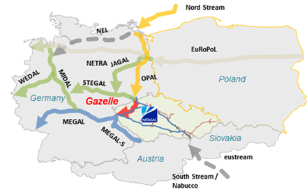 Газопровод GAZELLE протяженностью 166 км проходит с севера на юг Чехии. На севере GAZELLE соединен с германским газопроводом OPAL - отводом "Северного потока", проходящего по дну Балтийского моря. На юге чешский трубопровод стыкуется с газотранспортной системой MEGAL, по которой российский газ идет в южную Германию и во Францию. Таким образом, пуск GAZELLE позволит транспортировать российский газ, поступающий на север Европы в Южную и Юго- Восточную Европу. Мощность газопровода GAZELLE рассчитана на поставки до 30 млрд кубометров газа в год.
