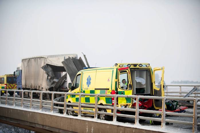 Как сообщает Expressen, авария на трассе E4 в южной части Швеции произошла, скорее всего, из-за сильного снегопада и гололеда.