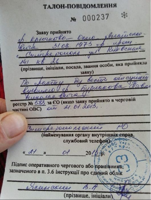 «В 2012 году в поселке Комсомольское общежития ПМК-6 проживал гражданин Бурлаков Павел Николаевич, 1963 года рождения, уроженец Донецка. До сегодняшнего момента он не появляется по вышеуказанному адресу прописки. Прошу принять меры к розыску Бурлакова», - говорится, в частности, в заявлении журналиста Олега Крючкова.