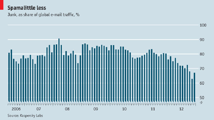 В свежем Economist любопытный график: доля спама в общем объеме трафика за последние шесть лет, по месяцам. Налицо тенденция на снижение этой доли. Со ссылкой на информацию Kaspersky Lab журнал сообщает нам, что после пика больше 90%, который пришелся на начало 2008 года, за последние 18 месяцев доля спама в переписке снизилась с 83% до 67%.