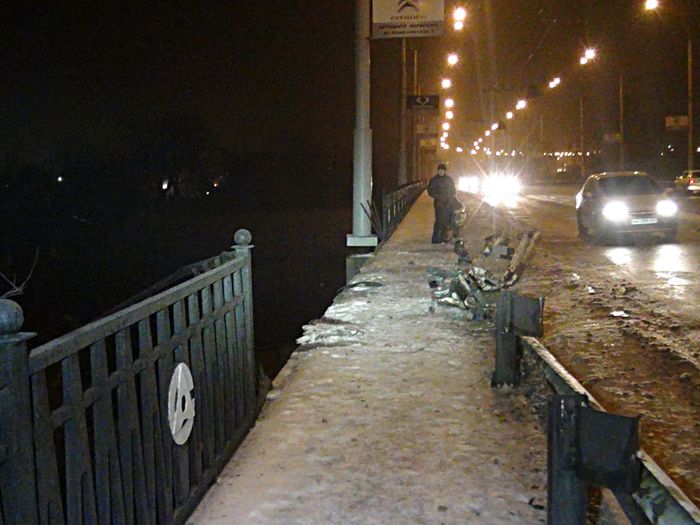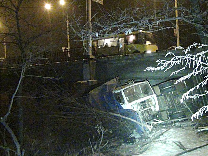 В Мариуполе грузовой автомобиль МАЗ с прицепом свалился с 5-метрового моста через реку Кальмиус.