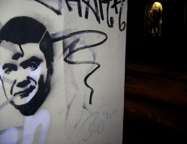 Во Львове активисты, солидарные с осужденными за скандальные трафареты жителями Сум, нанесли на стены города портреты Януковича с третьим глазом на лбу.