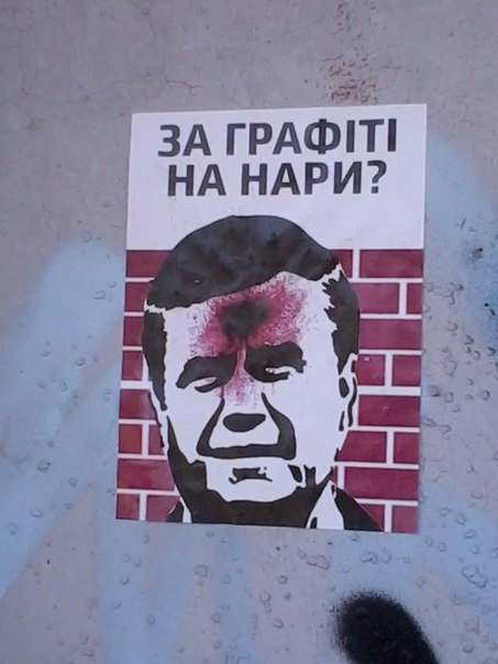 На наклейке есть надпись "За граффити на нары?". А также изображено лицо, похожее на Януковича, с характерной красной точкой во лбу.