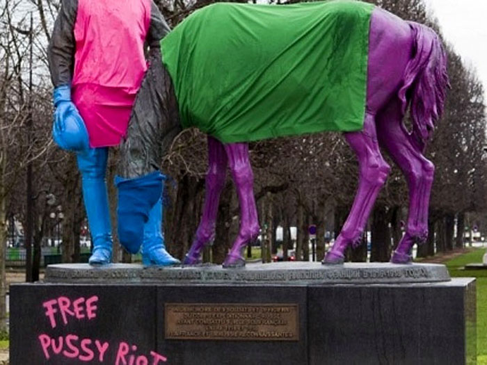Хулиганы осквернили установленный в Париже памятник Русскому экспедиционному корпусу. В ночь на 7 февраля неизвестные расписали монумент цветами, в которые одевались участницы скандальной панк-группы Pussy Riot. Вандалы призывают освободить находящихся за решеткой девушек, сообщает Obsession.
