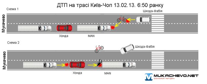 По показаниям водителя грузовика, который двигался со стороны Мукачево по полосе, на которой лежала женщина, он уже увидел тело на дороге и резко затормозил, чтобы не переехать ее. В результате автомобили, которые двигались позади грузового автомобиля, протаранили его сзади.