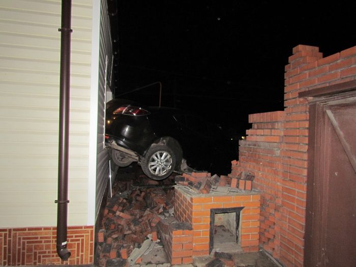 В полете автомобиль "Мазда" разрушил кирпичный забор и припарковался на подоконнике частного дома.