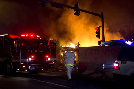По местному телевидению показали охваченный огнем торговый центр в районе Кантри-Клаб Плаза.