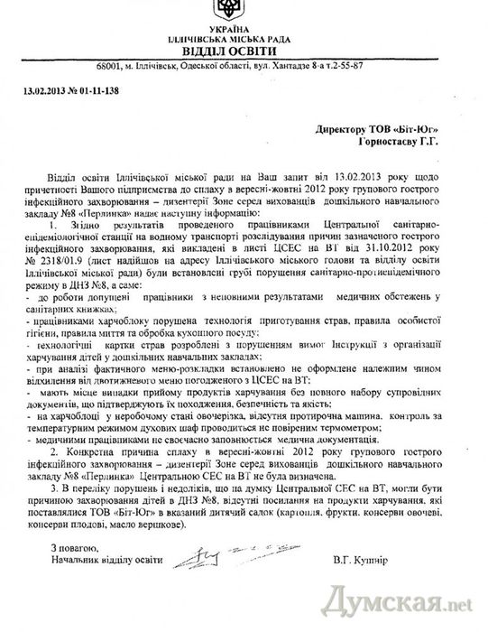 «Директор связывает появление подобных слухов с борьбой за рынок школьного питания Одессы. По словам Геннадия Горностаева, уже несколько лет подряд накануне тендера в мэрию и СМИ поступают жалобы от родителей. При этом зачастую эти документы оказываются фальшивыми», - отмечают одесские журналисты.