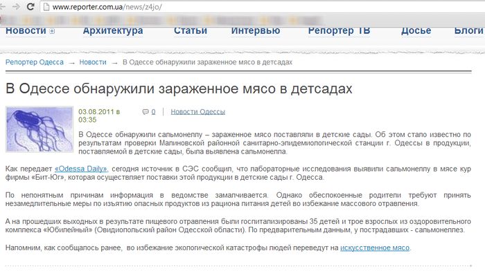 Напомним, в августе 2011 года издание reporter.com.ua со ссылкой на «Odessa Daily» сообщило о том, что в Одессе выявлены случаи поставок в детские сады мяса, зараженного сальмонеллой.