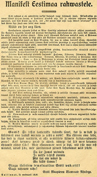 Напомним, 24 февраля 1918 года Манифест ко всем народам Эстонии был обнародован в столице республике, в городе Таллине. Проект Декларации был подготовлен Комитетом спасения Эстонии, избранным старейшинами Земского совета Эстляндии. Первоначально предполагалось объявление 21 февраля 1918 года, но провозглашение было отложено до вечера 23 февраля, когда манифест был напечатан и зачитан вслух публично в Пярну. На следующий день, 24 февраля, манифест был напечатан и распространен в Таллине.