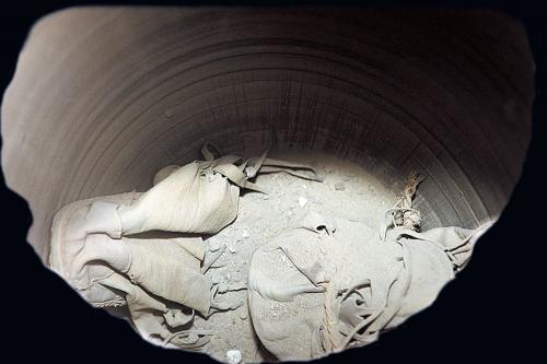 В сосуде были найдены две пары детской обуви. Их длина составила 18 см. Они были связаны веревкой из пальмового волокна и помещены во взрослую "туфлю". Еще одна пара обуви длиной 24 см принадлежала взрослому человеку, который, как установили ученые, хромал. Обувь, сделанная из кожи, хорошо сохранилась, однако со временем стала очень хрупкой.