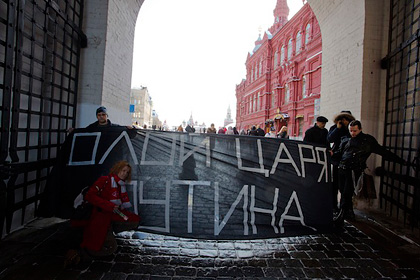 Оппозиционеры приковали себя наручниками к железным решеткам у Иверских ворот. В воротах они растянули протестный плакат. Как пишет Лента.ру, примерно через 10 минут активистов задержала полиция.