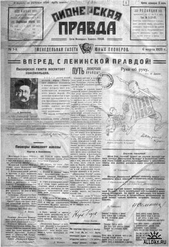 В 1925 году в Москве вышел пилотный номер еженедельной пионерской газеты "Пионерская правда". Концепцией газеты являлось просвещение и идеологическое воспитание детей. Главным редактором был Николай Бухарин. В основании детской газеты принимали участие Максим Горький, Аркадий Гайдар, Самуил Маршак, Владимир Маяковский, Лев Кассиль, Надежда Крупская.