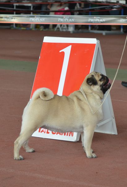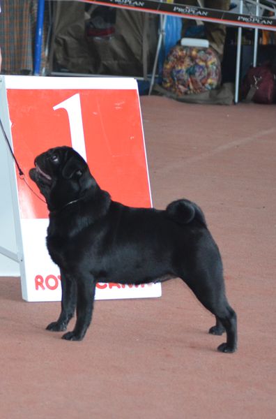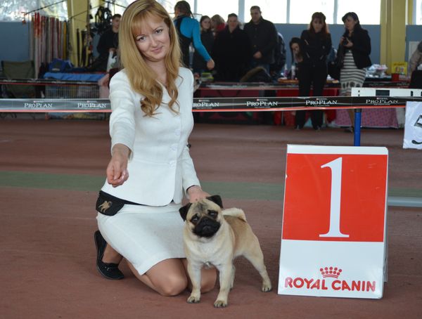 В Донецке именно два мопса харьковского питомника получили наивысшую оценку CACIB - кандидат в международные чемпионы по красоте, одна собака выиграла титул R.CACIB - резервный кандидат в международные чемпионы по красоте, еще две получили CAC - кандидат в национальные чемпионы по красоте. Ну, а Sprogu Bright Brilliant at Habenero стал лучшим представителем породы на выставке в Донецке.