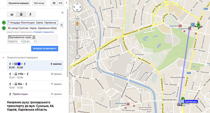 Сейчас информация о маршрутах общественного транспорта доступна для следующих городов: Киев и пригород, а также Винница, Днепропетровск, Донецк, Житомир, Запорожье, Луцк, Львов, Одесса, Полтава, Ровно, Севастополь, Харьков, Черкассы и Чернигов.