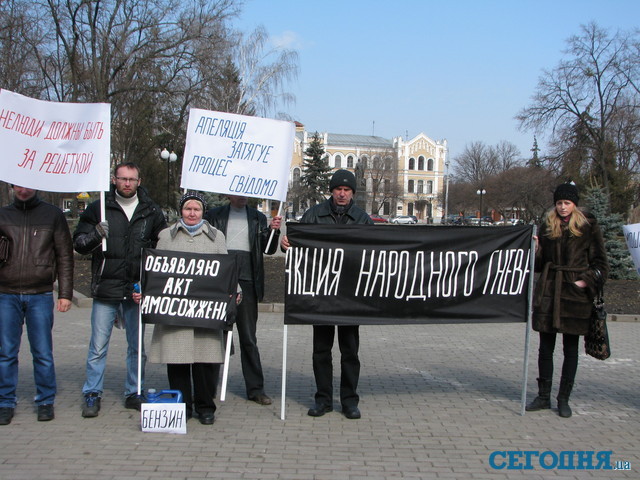 С плакатами «Нелюди должны быть за решеткой», «Объявляю акт самосожжения» и даже канистрой бензина харьковчане требовали, чтобы приговор наконец-то вступил в силу, а они могли вернуть свои квадратные метры.