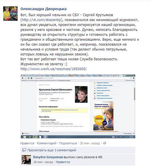 «Вот, был хороший мальчик из СБУ - Сергей Крутьяков, познакомился как начинающий журналист, все думал увидеться, проектами интересуется нашей организации, резюме у него красивое и честное. Думаю, написать благодарность руководству за открытость структуры и готовность работать с гражданами и общественными организациями. Верю, еще немного и он бы сам сказал где работает, и, например, пожаловался на начальника и условия труда (так делают обычно патрульные, которых ловишь на нарушении закона). Вот так вот работает Наша милая Служба безопасности», - написала сегодня ночью Дворецкая.