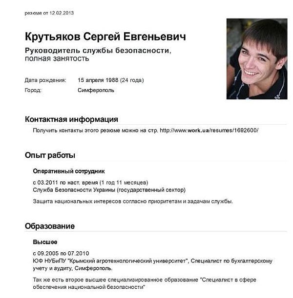 В резюме, в частности, было указано, что 24-летний Крутьяков из Симферополя, имеет высшее образование и якобы является оперативным сотрудником СБУ.