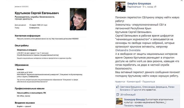 В частности, координатор Винницкой правозащитной группы Дмитрий Гройсман написал у себя на странице: «Поможем перепостом СБУшному оперку найти новую работу!