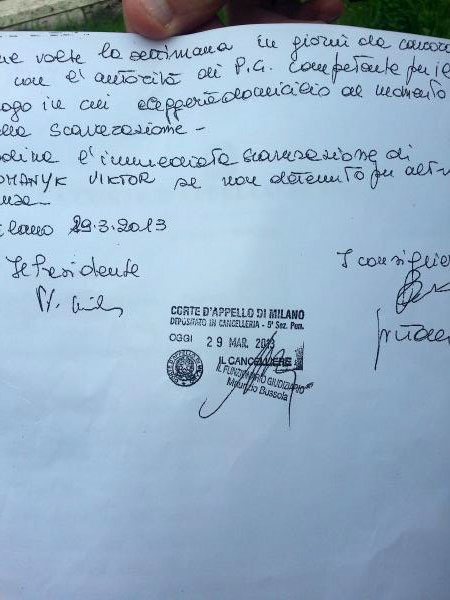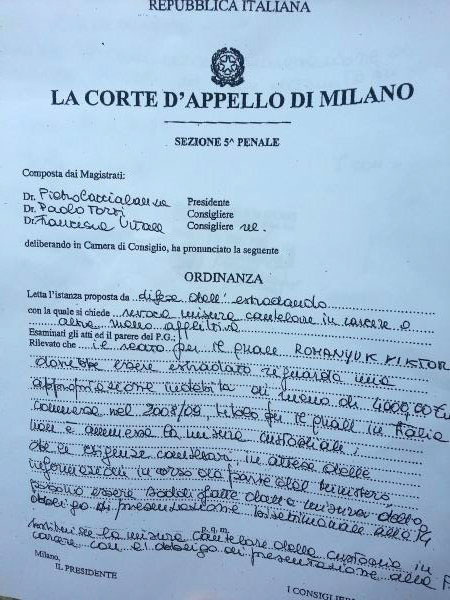 "Романюк освобожден из миланской тюрьмы решением La corte d'Appello di Milano! Несколько минут назад мы получили на руки решение. В ближайшие сутки Виктор будет на свободе!", - написал он на своей странице в Facebook.