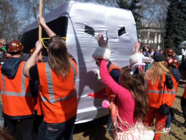"Состав" имени экс-вице-премьера Колесникова привезли с собой участники карнавала из Харькова. Горе-поезд сопровождала бригада ремонтников в оранжевых робах, которые уже собаку съели на устранении поломок.