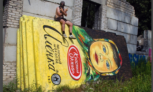 Огромные граффити, которые он создавал, пишет Radio Free Europe, «с поразительной точностью изображали все то, что он считал чумой современной России: бедность, недалекость, жадность».