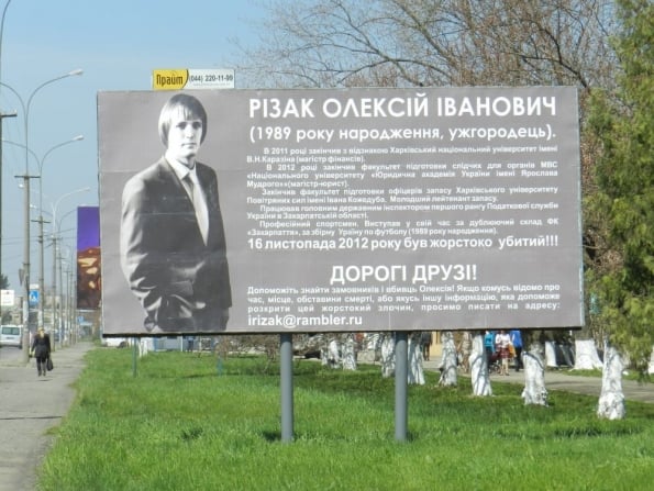 Экс-губернатор Закарпатья Иван Ризак заказал по Ужгороду несколько билл-бордов с портретом своего покойного сына 23-летнего Алексея Ризака. Он погиб 16 ноября 2012г.: выпал из 16-этажки по проспекту Свободы в Ужгороде.
