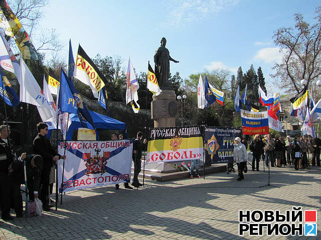 Собравшиеся держали лозунги «Наше будущее с Россией», «Русский язык для Украины – родной». В мероприятии, как отмечает Новый регион, приняли участие Русская и Российская общины Крыма, казачья община «Соболь» и прочие пророссийские организации.
