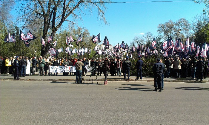 У самого здания суда бюджетников гораздо меньше, чем было 12 апреля - 200-300 человек с флагами "Стоп фашизм" выстроились перед судом.