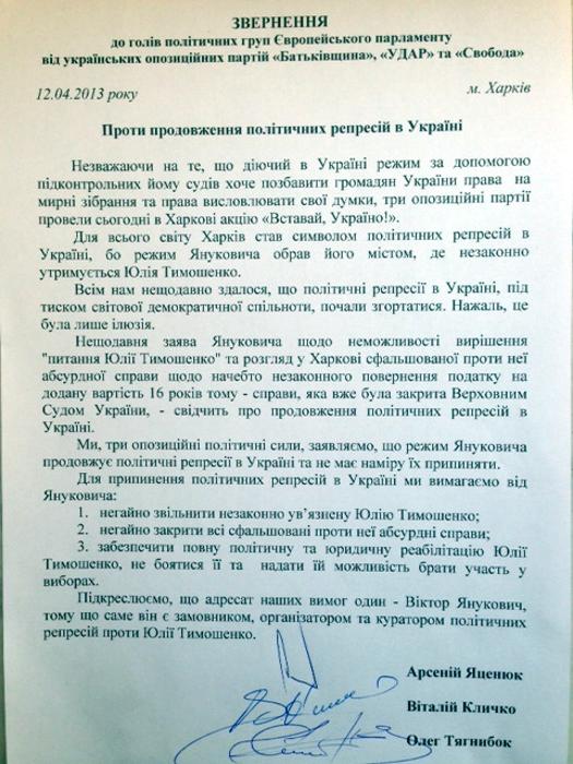 Ми, три опозиційні політичні сили, заявляємо, що режим Януковича продовжує політичні репресії в Україні та немає наміру їх припиняти.