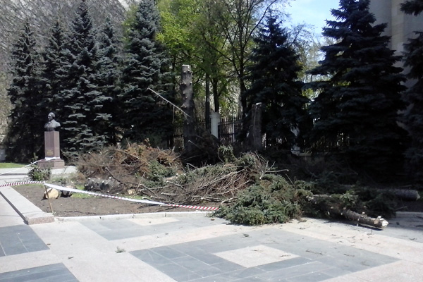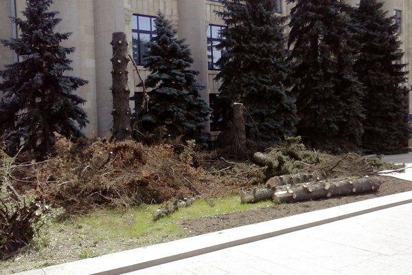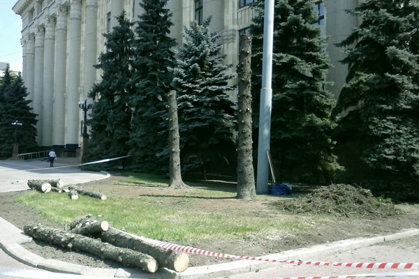 Фото-факт: В Харькове возле обладминистрации пилят ели