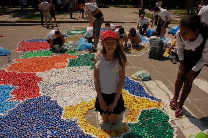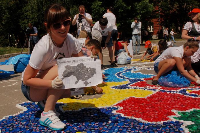 60 тысяч крышечек от пластиковых бутылок. Студенты Политеха и харьковские школьники выложили из мусора огромную карту Украины.
