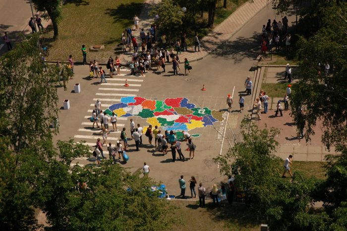 Разноцветную Украину хорошо видно с высоты птичьего полёта — с крыши главного корпуса НТУ «ХПИ». Цвета областей подбирали просто — «чтоб красиво сочетались между собой». Никакого подтекста, уверяют организаторы. Только Харьков зелёный намеренно — таким видят родной город старшекурсники.