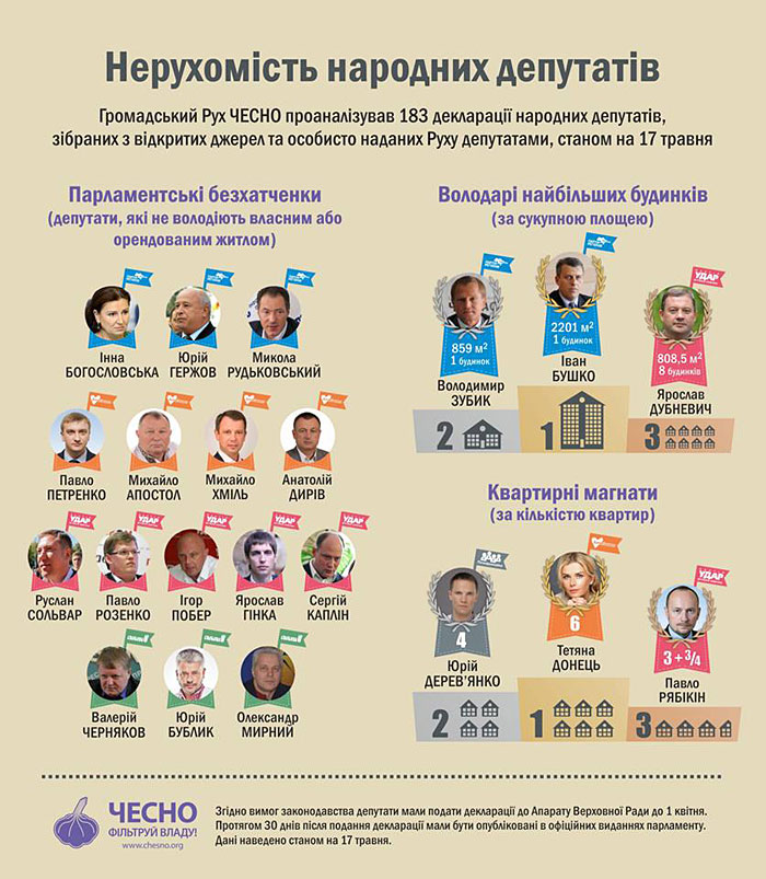 Движение "Честно" проанализировало декларации о доходах 183 депутатов из 455 (другие депутаты, в большинстве своем - регионалы и коммунисты, декларации не опубликовали). Как выяснилось, минимум 15 парламентариям негде жить.