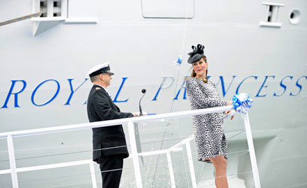 Герцогиня Кембриджская разрезала ленту, протянутую с берега, которая удерживала на весу бутылку шампанского объемом в 15 литров, разбившуюся о борт лайнера. Таким образом, по традиции, судно получило имя.