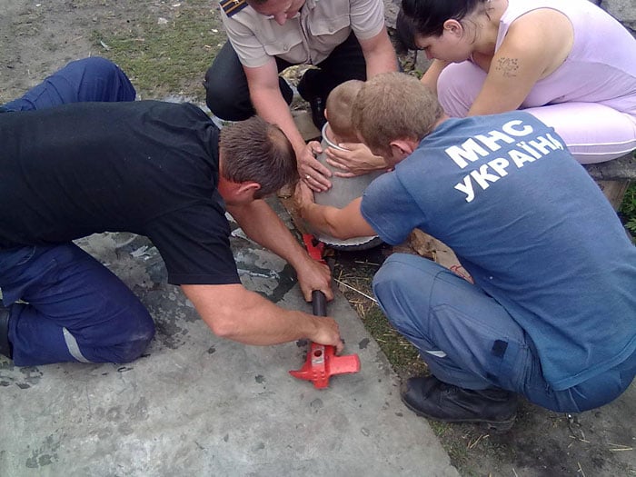 В с. Чернещина (Боровской район Харьковской области) спасатели вызволили из 15-литрового алюминиевого бидона трехлетнего малыша.