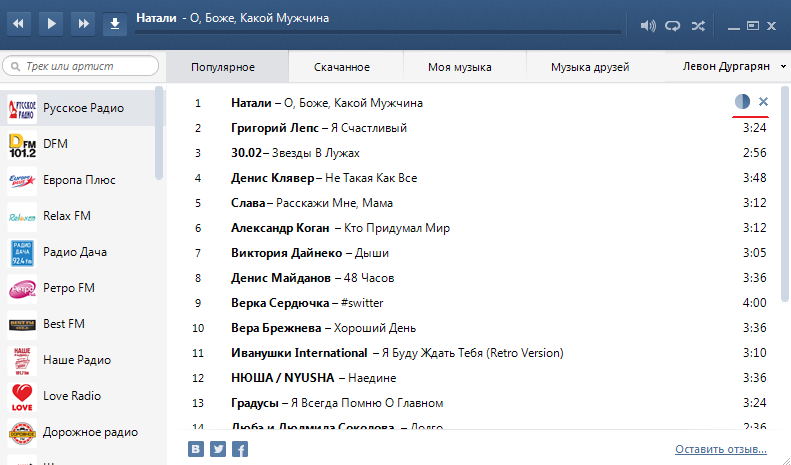 Скачиваются треки одним кликом справа от названия записи по стрелочке вниз. Если вы ищите конкертную песню или композицию, то проще воспользоваться поиском. Также можно просмотреть репертуар каждой из представленных слева радиостанций.