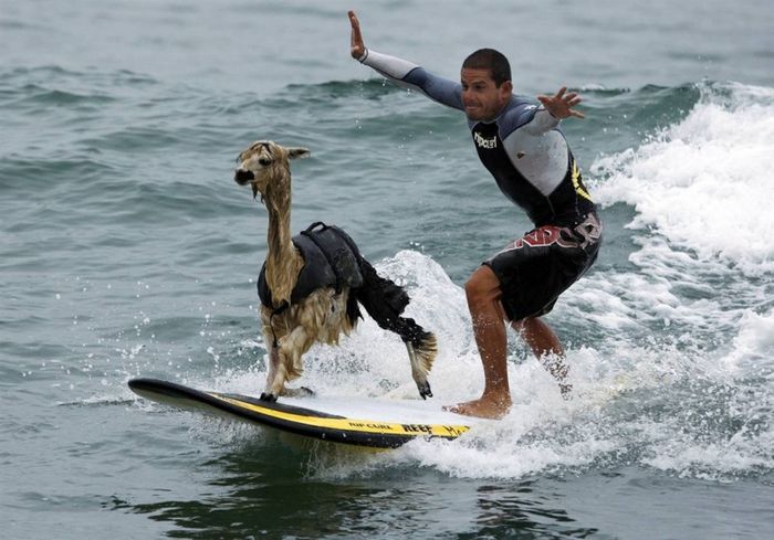 Альпаки – это милые и добрые животные, которые обитают на горных склонах Анд. Часто жители Перу и Чили держат их в качестве домашних любимцев, поскольку шерсть альпака ценится во всем мире. Этим экзотическим зверькам не свойственно плавать в океанских просторах, поэтому Доминго Пьянесси понадобилось целых два месяца, чтобы поставить альпака на доску. Кстати, Пьянесси – это первый в мире серфингист, который отважился на подобный эксперимент. Являясь одним из лучших тренеров в мире, он уже более 10 лет обучает своему делу собак и выиграл не один чемпионат по собачьему серфингу. По словам Доминго, путешествуя по Австралии, где на доску смело ставали кенгуру, коалы и даже свиньи, он принял решения взяться за что-то новое и научить серфингу перуанского альпака.