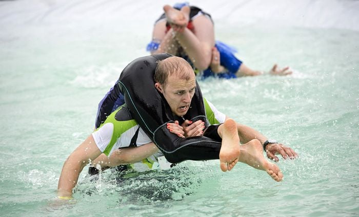 Участникам-мужчинам было необходимо с женой на плечах преодолеть полосу препятствий, в том числе пройти через водные преграды и сделать несколько прыжков через перекладину, за максимально короткое время.