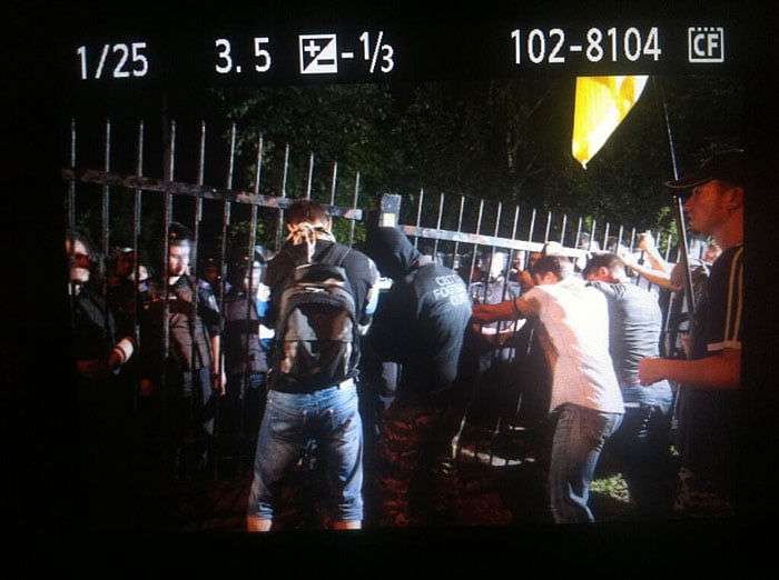 Около 22:00 протестующие повалили забор у Святошинского райуправления милиции и попытались проникнуть в помещение.