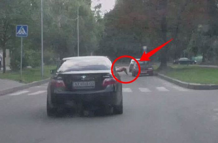 А затем, при обгоне «Тойоты» другим автомобилем, угрожающе поднимает оружие вверх; водитель в это время выезжает на встречную полосу, бросаясь вдогонку обогнавшему.