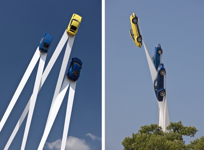 Три белые стальные стрелы весом более 22 тонн и высотой 35 м символизируют рейсинг. Каждая стрела увенчана автомобилем Porsche: модель Original 911 (1963 г. выпуска), 911 Carrera RS 2.7 ( 1973 г. выпуска) и 911(2013 г. выпуска).
