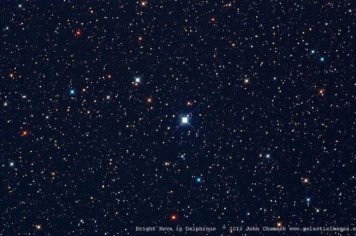В ночь с 14 на 15 августа астроном-любитель Коити Итагаки обнаружил в созвездии Дельфина новую звезду, которой не было на любительских картах звездного неба. Блеск звезды составил 6,8m, а затем вырос до 4,3m, что уже позволяет увидеть вспышку невооруженным глазом из мест, благоприятных для астрономических наблюдений. В сельской местности, вдали от городской засветки, человек с нормальным зрением может видеть звезды 5,5 величины (чем меньше величина, тем более яркой кажется звезда, шкала логарифмическая).