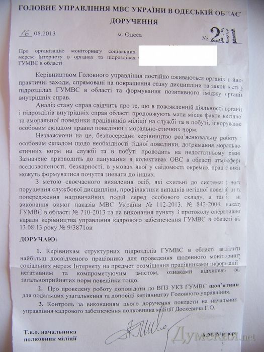 Об этом идет речь в поручении за подписью полковника Мисюры, копией которого располагает «Думская».