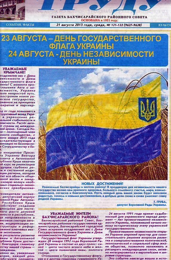 Бахчисарайская районная газета «Слава труду» опубликовала поздравление народного депутата Украины, члена фракции Партии регионов Григория Грубы по случаю празднованию Дня государственного флага Украины и Дня Независимости, сопроводив его флагом неизвестного государства.
